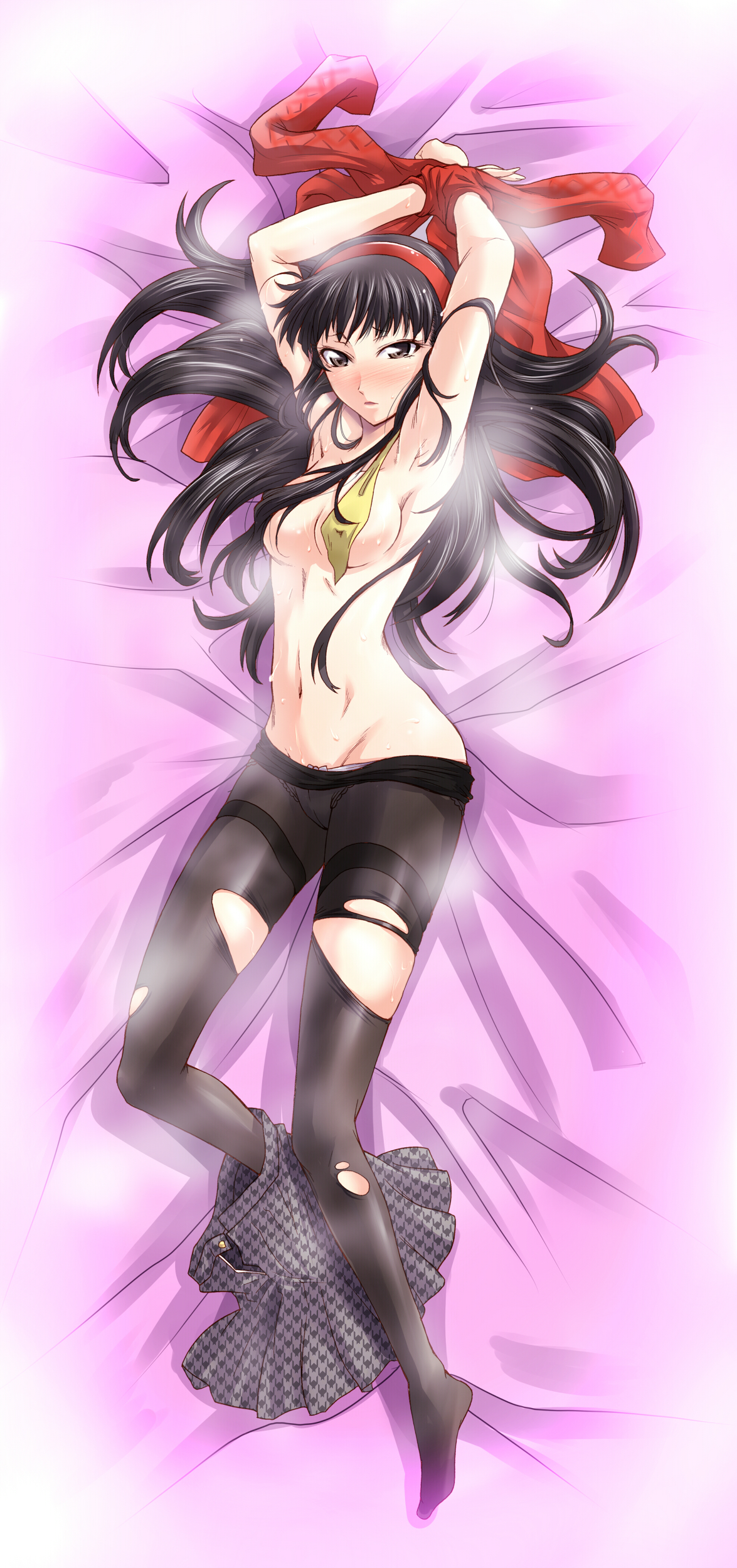 1girlarmpitsarms upbdsmblack eyesblack hairblushbondageboundbreastscensoredconvenient censoringdakimakura (medium)female focusfull bodyhair censorhair over breastshairbandlong hairlyingminiskirtnavelno brapantiespanty pullpantyhoserestrainedskirtsmellsolosweatsweaterthighband pantyhosetorn clothestorn pantyhoseunderwear