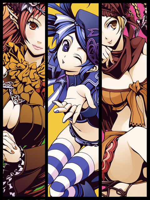 3girlsblue eyesblue hairbreastsbrown haircleavagelarge breastsmultiple girlsone eye closedred hairthighhighswink