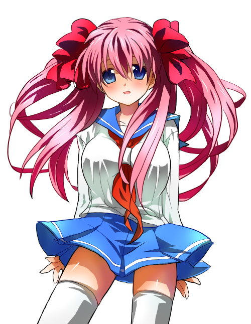 00sblue eyesblushbowbreastshair bowhuge breastslong hairpink hairschool uniformserafukusimple backgroundsmilesolothighhighstwintailswhite thighhighszettai ryouiki