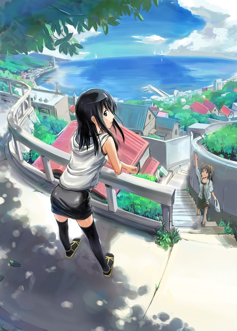 2girlsassbagblack eyesblack hairblack thighhighsboatbrown haircityclouddaydressfrom behindhillhoodlong hairlooking backminiskirtmultiple girlsoceanoutdoorsplastic bagponytailrailingsailboatsandalssceneryshadeskirtskysmilestairsthighhighstreewaterwatercraftwavingzettai ryouiki