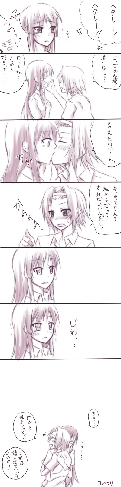 00s2girlsblunt bangsblushcomichime cuthugkisslong hairmonochromemultiple girlsschool uniformshort hairyuri