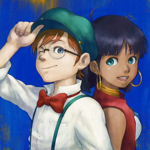 1990s (style)1boy1girlahogebandeaubare shouldersblue eyesbowbowtiedark skinearringsglassesgreen eyeshatjewelrylooking backneck ringnecklaceone eye closedpurple hairshort hairsmilestraplesssuspenderstube topvestwink