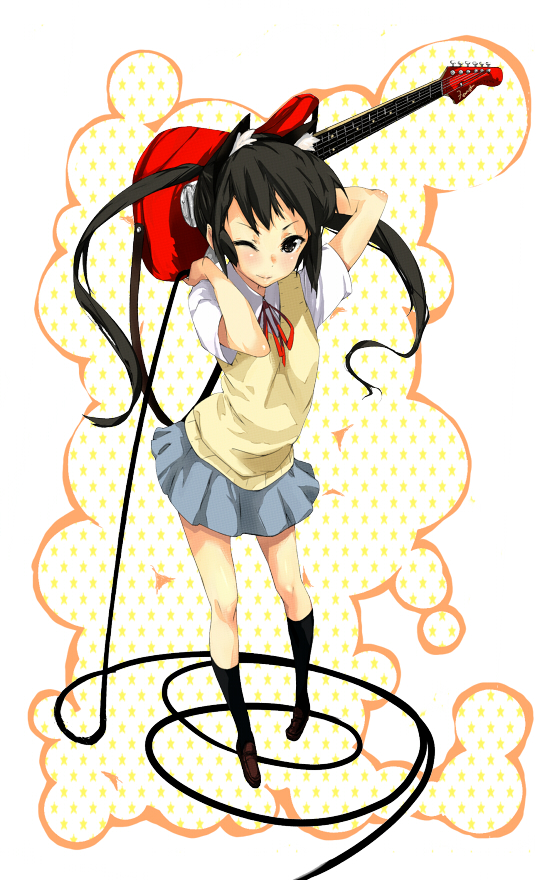 00s1girlanimal earsblack eyesblack hairblushcat earscat girlfemale focusguitarinstrumentlong hairmustang (guitar)one eye closedschool uniformskirtsmilesockssolotwintailswink