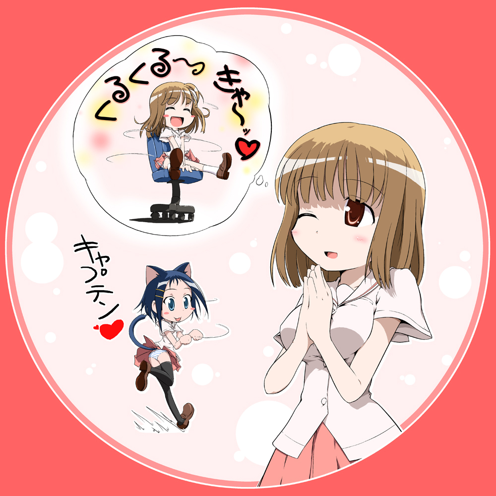 00sanimal earsblue eyesblue hairblushbrown eyesbrown haircat earscat tailchairhair ornamenthairclipone eye closedschool uniformshort hairskirtsmilespinningtailthighhighswinkzettai ryouiki