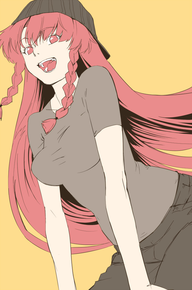 1girlalternate costumebraidcontemporaryfangsfemale focushatlong hairorange backgroundred eyessimple backgroundsketchsmilesolotwin braids