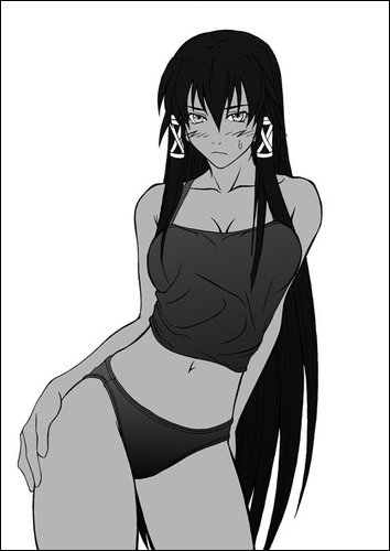 00s1girlblack hairblushbreastscleavagecollarbonedark skindark-skinned femaleembarrassedfemale focushair tiehair tubeshand on own leglong hairlooking at viewermidriffmonochromenavelpantiessimple backgroundsolostandingstomachtank topthighsunderwearvery long hairwhite background