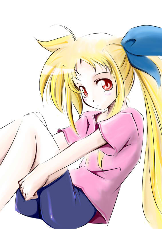 00s1girlbike shortsblonde hairblushchildfemale focushair ribbonlong hairred eyesribbonshirtshortssolot-shirt