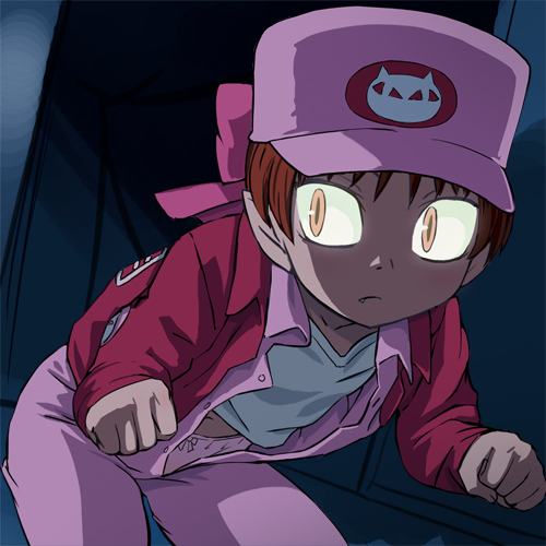 1girlbowfangfemale focushatjacketnavelpantiespink bowpointy earsred eyesred hairsolosquattingunbuttonedundershirtunderwear