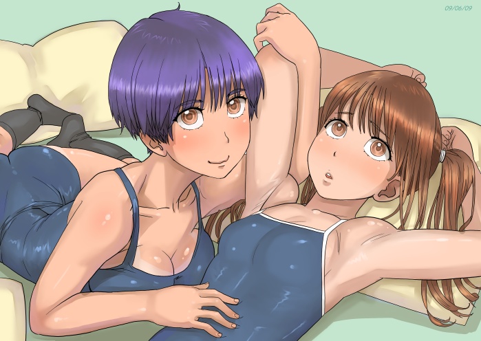 2girlsarmpitsarms upblushbreast restbreastsbrown eyesbrown haircleavagedatedgreen backgroundlooking afarlooking at viewerlyingmedium breastsmultiple girlson backone-piece swimsuitparted lipspillowpurple hairschool swimsuitshiny skinshort hairsimple backgroundsmall breastssmilesocksswimsuittantwintails