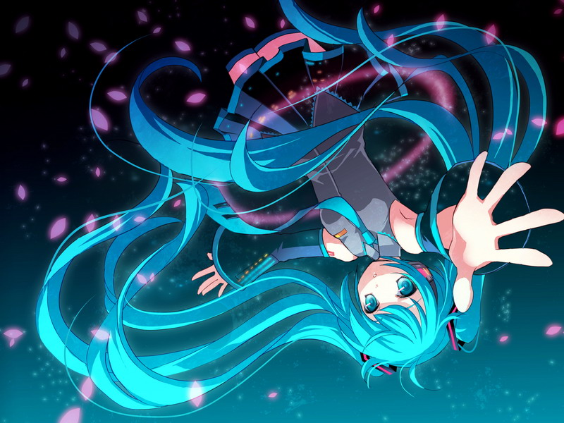 detached sleevesgreen eyesgreen hairlong hairnecktiepetalsskirtsolothighhighstwintailsvery long hairzettai ryouiki