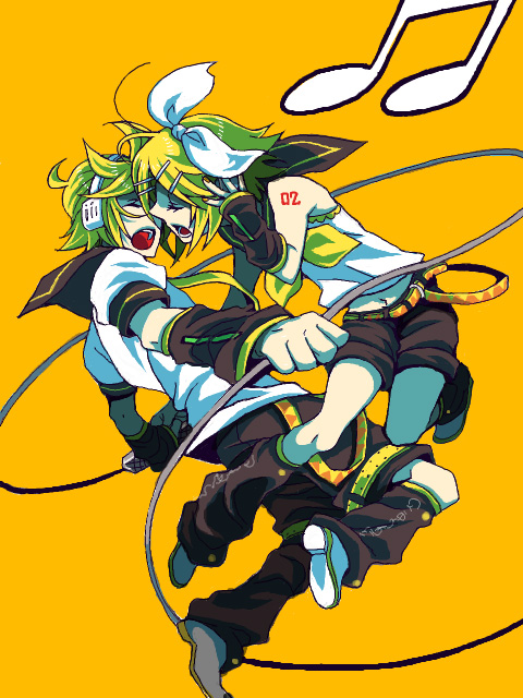 1boy1girlbeltblonde hairbrother and sistercableclosed eyeshair ornamenthair ribbonhairclipheadphonesmessy hairmidriffmusical notenecktieopen mouthribbonshort hairsiblingssimple backgroundtwins