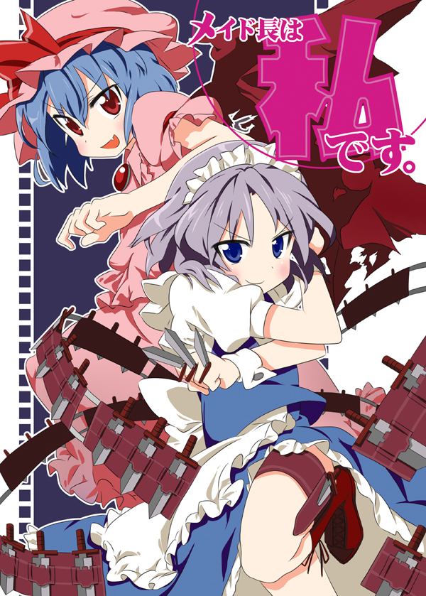 2girlsblue eyesblue hairfemale focushairbandhatknifemultiple girlsred eyesshort hairthrowing knifeweapon