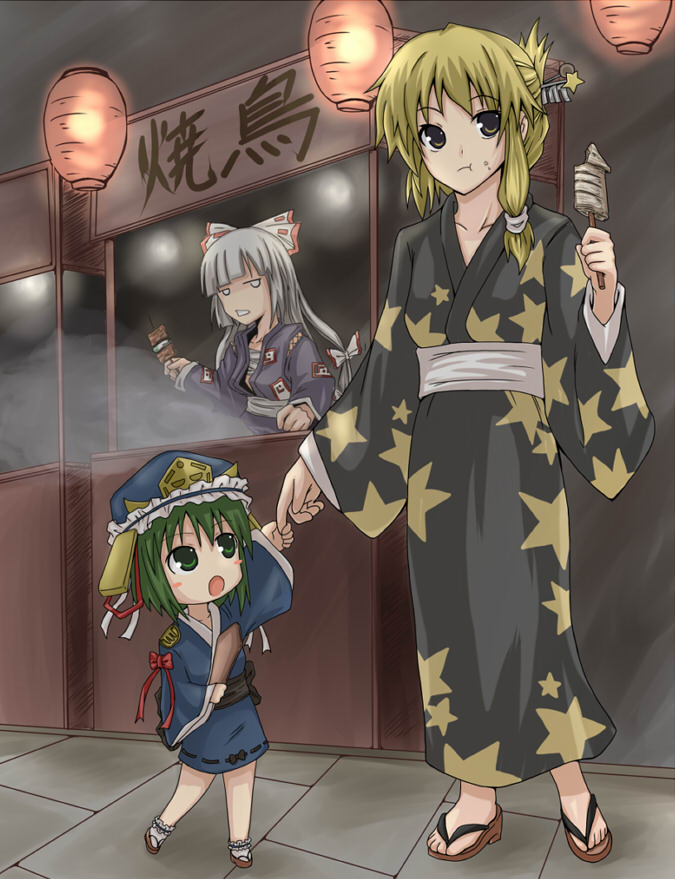 3girlsaged downalternate costumealternate hairstyleblonde hairchildeatingfemale focusfoodfood standgreen eyesgreen hairgrillhair ornamentjapanese clotheskimonolanternmultiple girlspaper lanternrod of remorseskewerstar (symbol)star printtime paradoxyellow eyesyukata