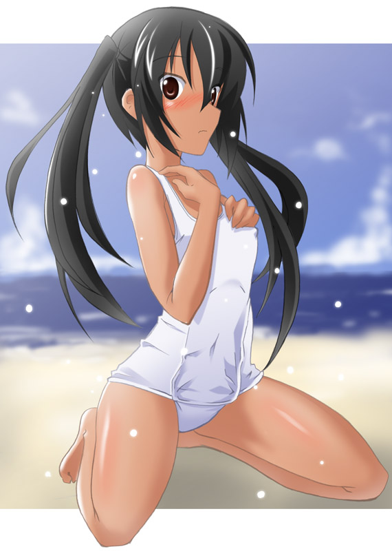 00s1girlbarefootbeachblack hairblushbrown eyesdayfemale focuskneelinglong hairone-piece swimsuitschool swimsuitsoloswimsuittantwintailswhite one-piece swimsuitwhite school swimsuit
