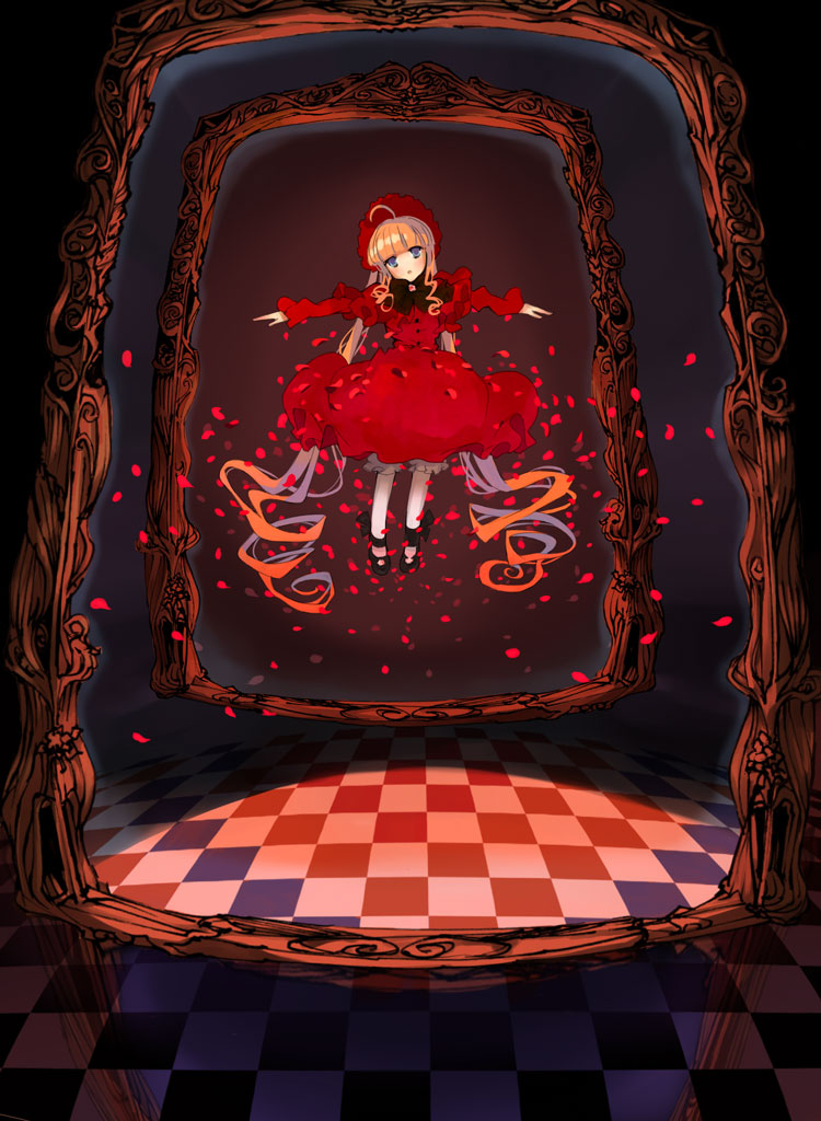 puchimu, nilou (genshin impact), genshin impact, highres, 1girl, alternate costume, apron, blue border, blue eyes, blue ribbon, blush, blush stickers, border, character name, chibi, cupcake, detached collar, fake horns, food, frilled apron, frilled headwear, frills, grid background, horned headwear, horns, index finger raised, long hair, looking at viewer, multiple views, one eye closed, open mouth, outline, parted bangs, polka dot, polka dot background, puffy short sleeves, puffy sleeves, red hair, ribbon, short sleeves, smile, star (symbol), twintails, upper body, waitress, wrist cuffs