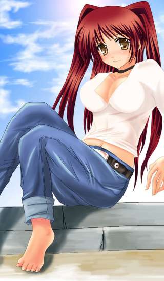 00s1girlbad anatomybarefootblushbreastsbrown eyescasualchokercleavagedaydenimfemale focusjeanslarge breastsmidriffnavelpantspoorly drawnred hairskysolo