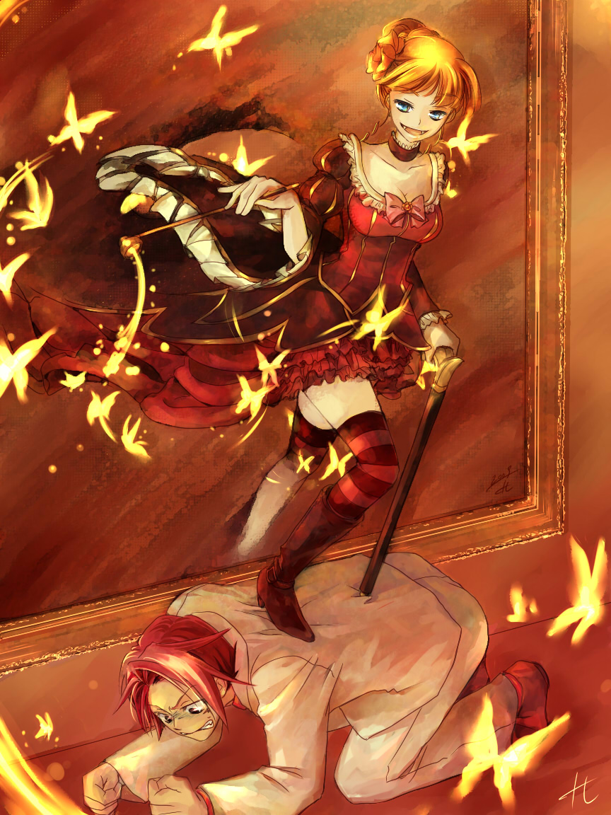00s1boy1girlall foursangryblonde hairblue eyesbootsbowbreastsbrown eyesbugbutterflycanechokercleavagedressfangfangsfemdomfrillsinsectjacketkiserupicture frameportrait (object)red hairribbonskirtsmilesmoking pipestriped clothesstriped thighhighsthighhighsthrough mediumthrough screentrample