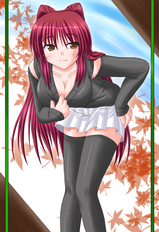 00sblack thighhighsbreastsbrown eyescleavageclothes pulldetached sleeveslarge breastsleaflong hairminiskirtred hairshirt pullskirtsolothighhighszettai ryouiki