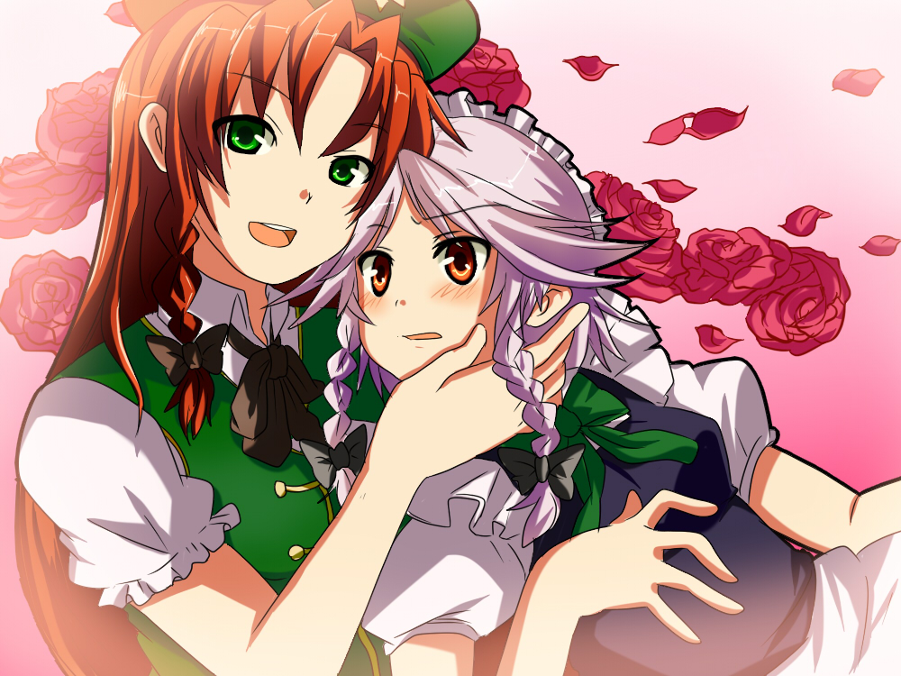 2girlsblushbraidfemale focusflowerhairbandhand on another's cheekhand on another's facehatmultiple girlsred hairribbonroseshort hairtwin braidsyuri