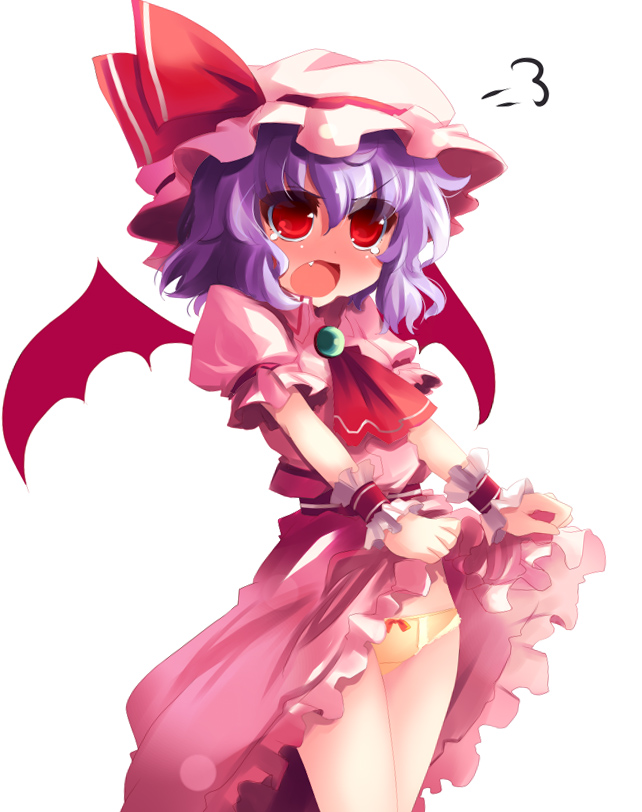 1girlangrybat wingsblushclothes liftdressdress liftfangfemale focushatpantiespurple hairred eyessolounderwearwhite backgroundwingswrist cuffs