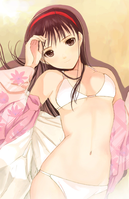 1girlbikiniblack hairbreastsbrown eyesfemale focushairbandjapanese clotheskimonolong hairlyingmedium breastsnavelsmilesoloswimsuitwhite bikiniyukata
