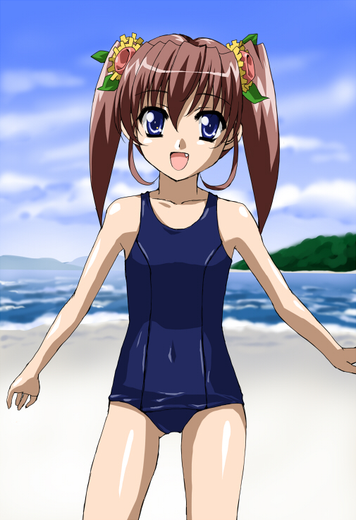 00s1girlbeachblue eyesbrown hairdayfangfemale focuslong hairone-piece swimsuitschool swimsuitsoloswimsuittwintails