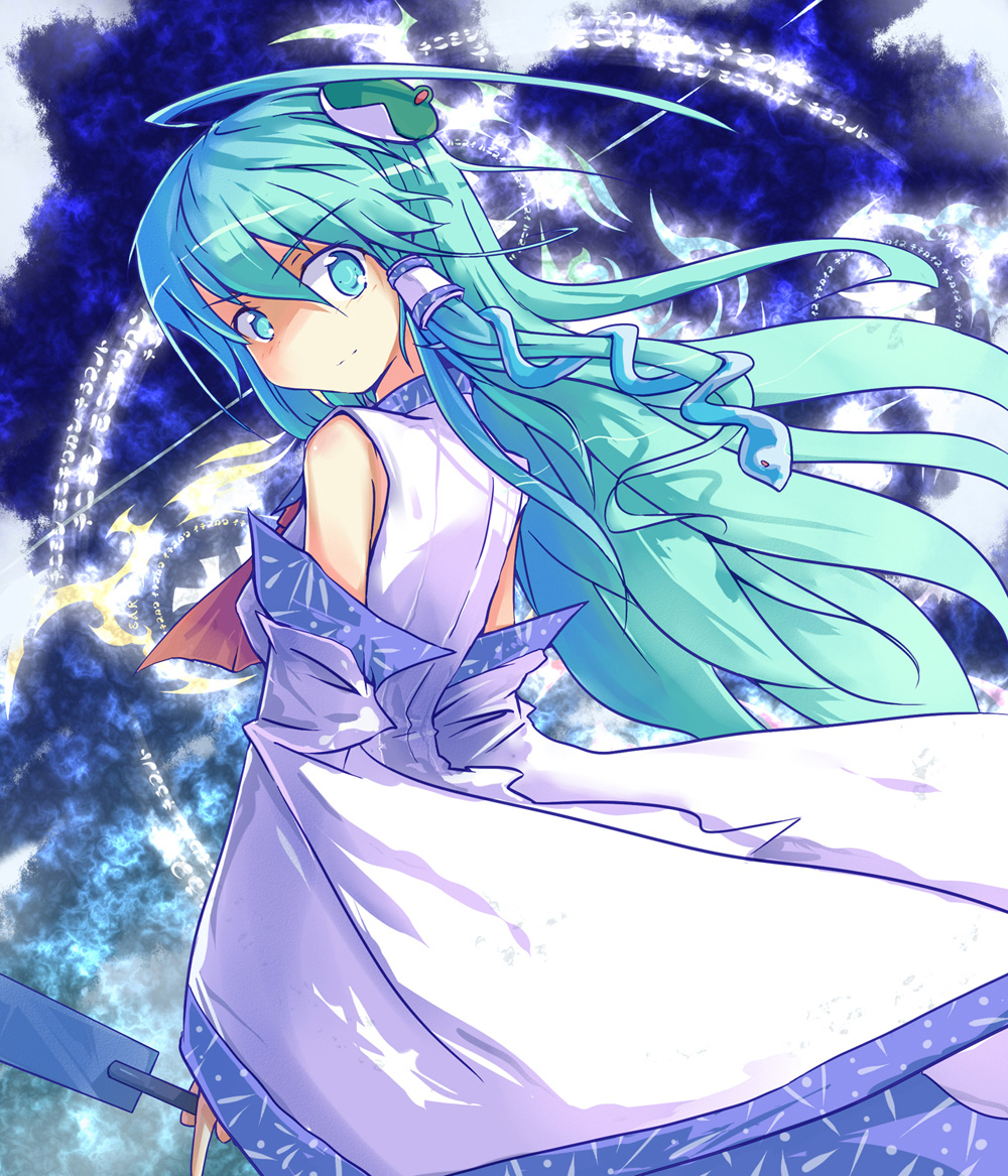 1girlaqua eyesaqua hairdetached sleevesfemale focusfroggoheigreen eyesgreen hairhair ornamentlong hairlooking backmatching hair/eyesoonusasnakesolo