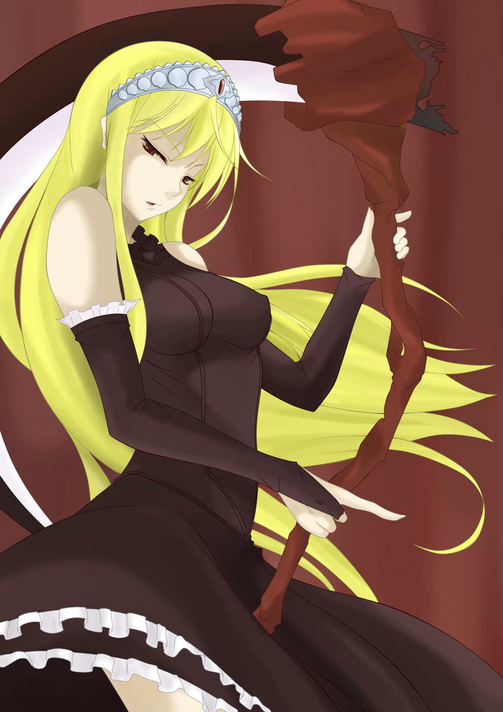 00s1girlbare shouldersblonde hairbreastsbridal gauntletsdressfemale focuslong hairpointingred eyesscythesolotiaravery long hair