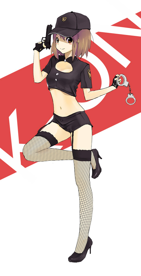 00s1girlbaseball capblushbreastsbrown eyesbrown haircleavagecuffsfemale focusfingerless glovesfishnet thighhighsfishnetsfull bodygarter beltglovesgunhandcuffshandgunhathigh heelslegspistolpolicepolice uniformpolicewomanred eyesshoesshort hairshort shortsshortssmilesolothighhighsweapon