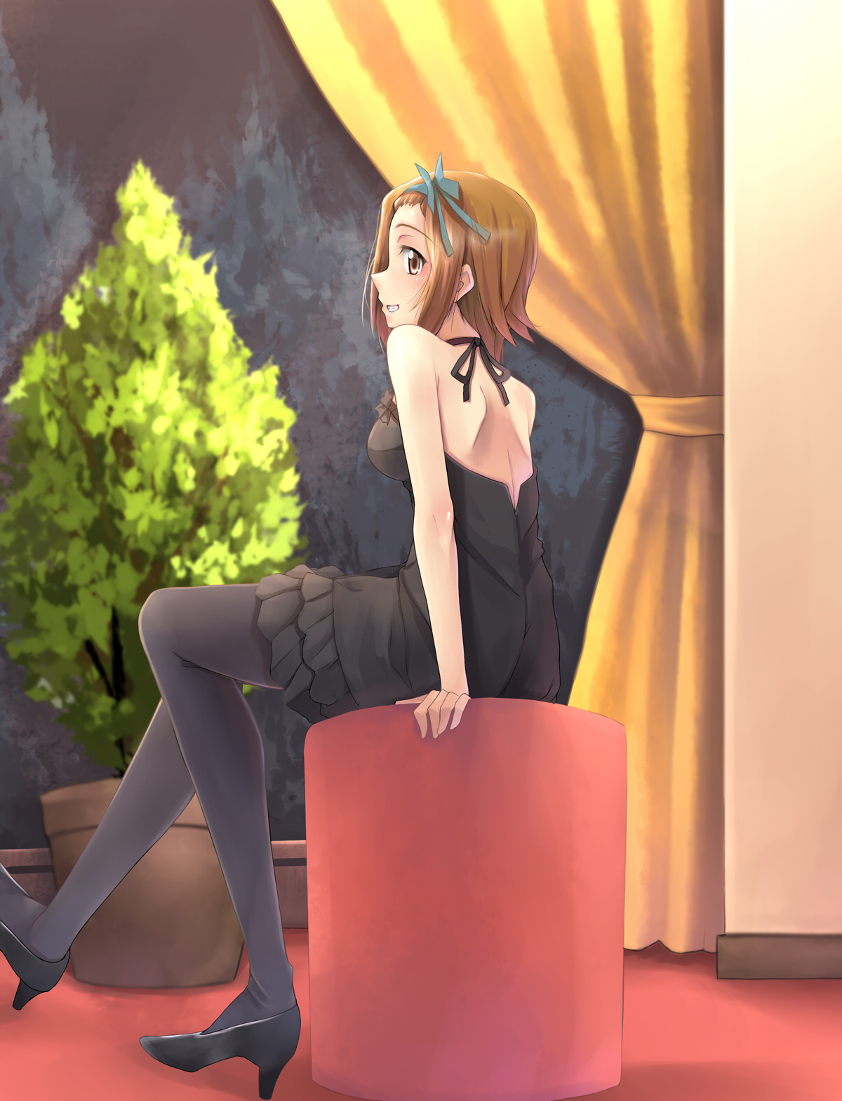 00s1girlbackbare shouldersbrown eyesbrown hairdressfemale focusformal clotheshigh heelslegslooking backpantyhoseshoessittingsolo