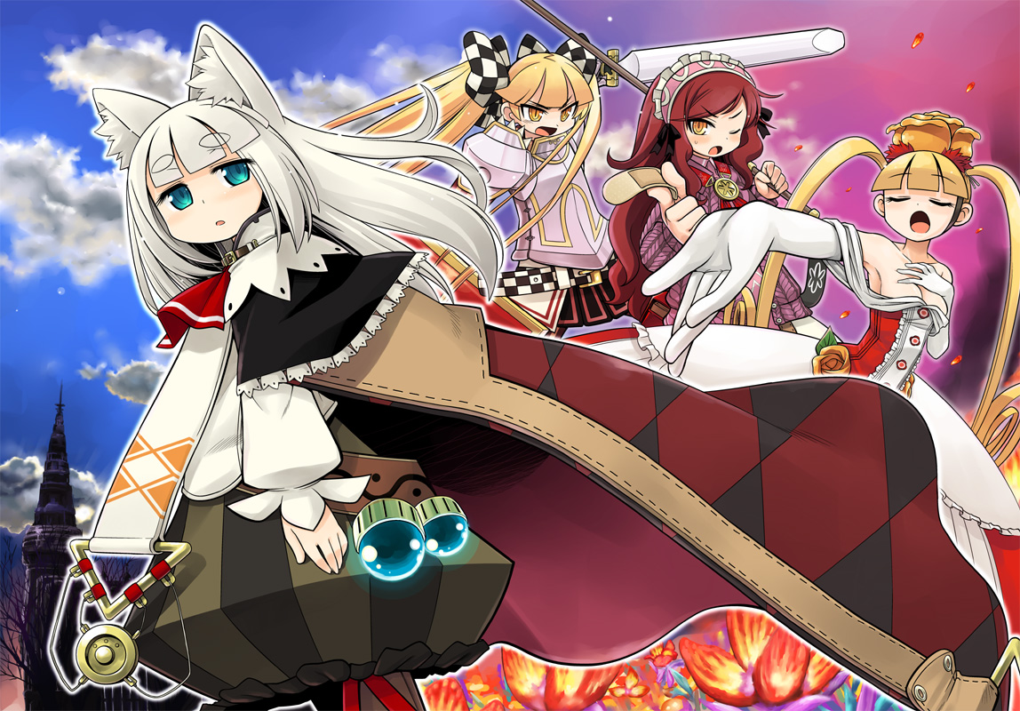 4girlsanimal earsarmorbandaidblushbreastscapecleavagedresselbow glovesfox earsgloveslong hairmedium breastsmultiple girlsmusicsingingswordtsunderetwintailsweaponwhite hair