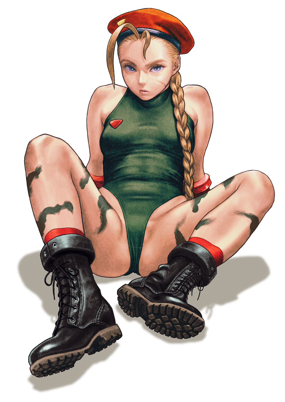 1girlantenna hairarm supportassbare shouldersberetblonde hairblue eyesbodypaintbootsbraidbreastscameltoecamouflagecombat bootsglovesgreen leotardhathighleghighleg leotardleotardlong hairlooking at viewerpartially visible vulvascarsittingspread legsthong leotard
