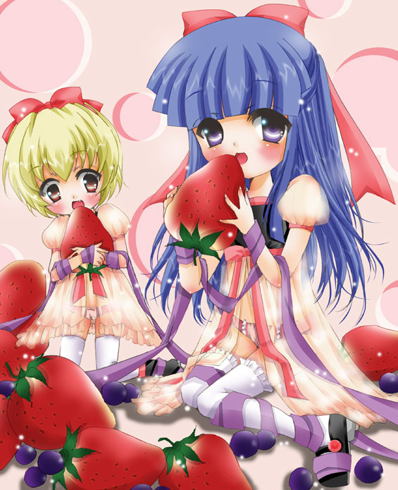 00s2girlsblonde hairblue hairblueberryblushbowbow pantiesfangfoodfruithair bowholdingholding foodholding fruitlong hairmultiple girlspantiespink bowpink pantiespurple eyesred eyesribbonsee-through clothesstrawberrythighhighsunderwear