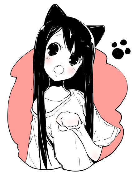 1girlanimal earsblushcat earscollarbonefangfemale focusloose clothesloose shirtmonochromeoff shoulderpaw posepaw printpink themeshirtsolo