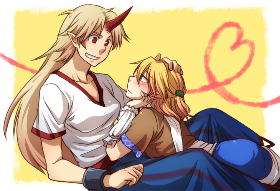 2girlsblonde hairblushfemale focusgreen eyeshalf updoheartheart of stringhornslong hairmultiple girlspointy earsred eyesscarfshort hairsingle horn