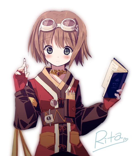 00s1girlblushbob cutbookbrown haircharacter namefemale focusfingerless glovesglovesgogglesgoggles on headgreen eyeslooking at viewerobject in pocketpen in pocketpocketred glovesshort hairsimple backgroundsolowhite background