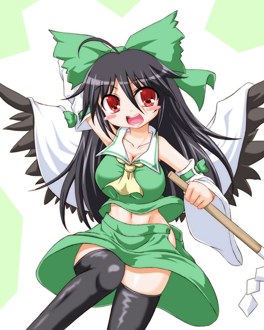 1girlahogeascotblack hairblack thighhighsblush stickersbowbreastscapecleavagecosplaydetached sleevesfemale focusgoheihair bowhakurei reimu (cosplay)japanese clotheslarge breastslong hairmidriffmikonavelno pantiesopen mouthred eyesskirtsolothighhighswings
