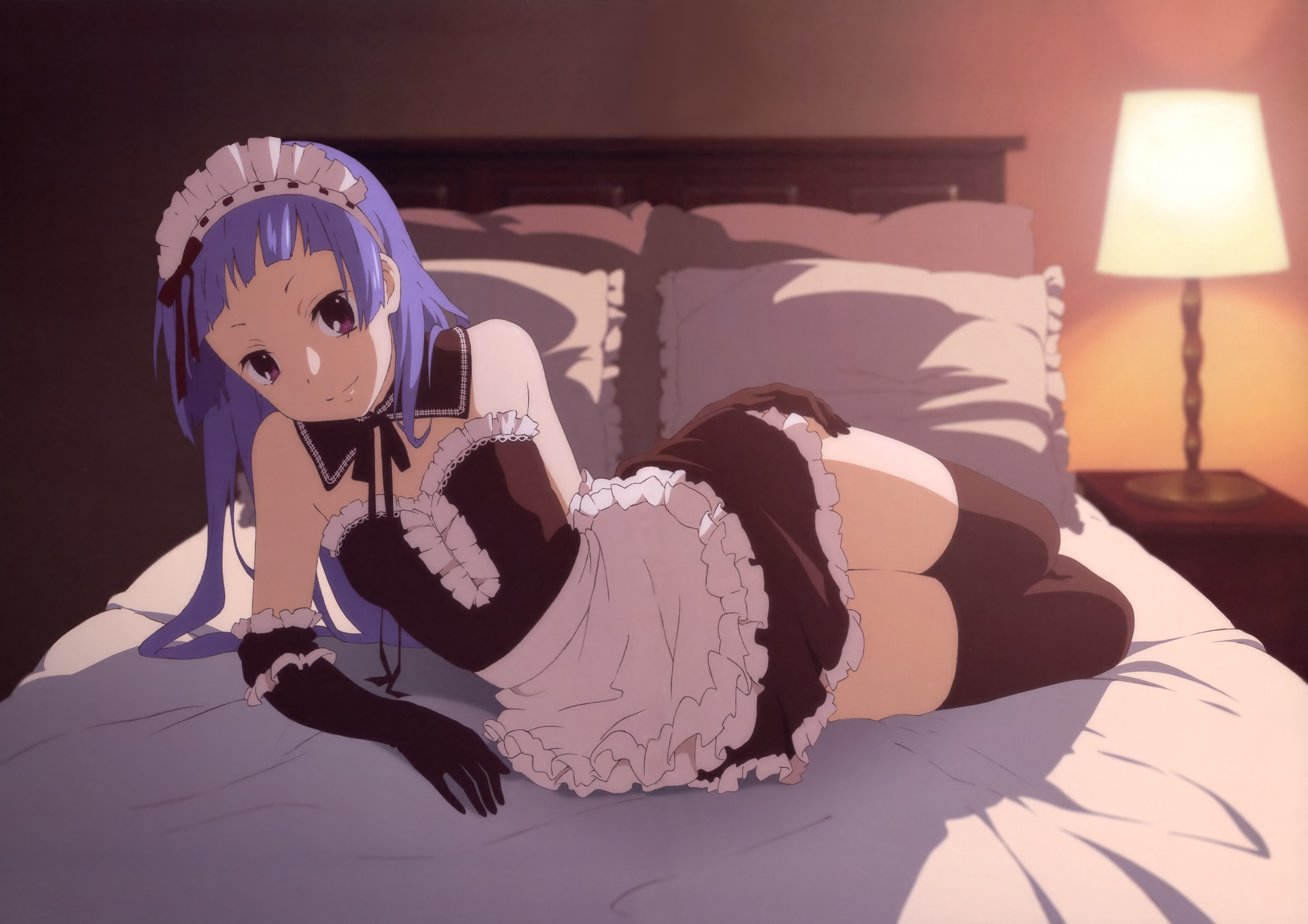 00s1girlbare shouldersbedblack thighhighsblue hairblunt bangselbow glovesfemale focusflat chestfrillsgloveslyingmaidpurple eyessolothighhighszettai ryouiki