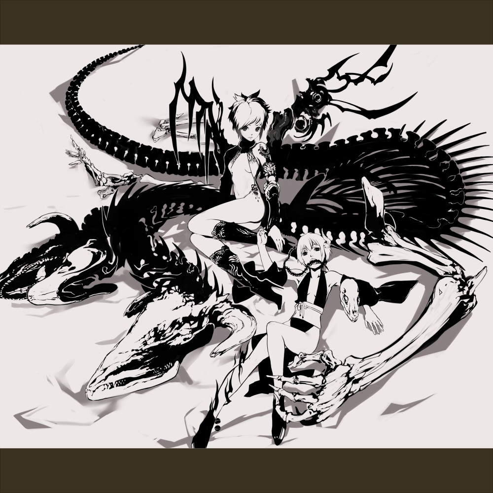 2girlsbreastscleavagedragonhigh heelshornsletterboxedmonochromemulticolored hairmultiple girlsshoesshort hairskeletonskullsmall breasts