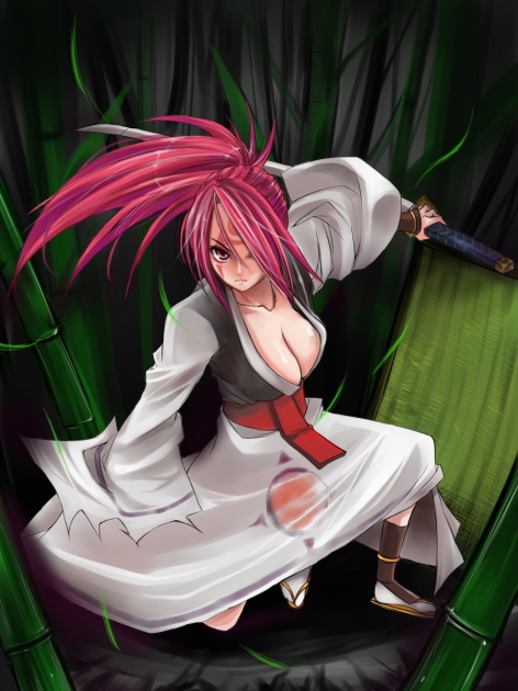 1girlbamboobreastscleavagefemale focushair over one eyejapanese clotheskimonolarge breastspink eyespink hairponytailsandalssoloswordweapon