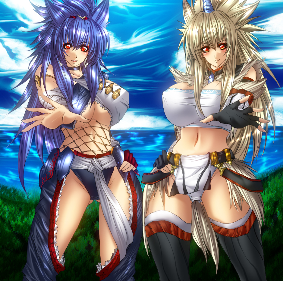 2girlsarmorblue hairbreastscleavageelbow glovesfishnetsgloveshairbandhornshuge breastskirin (armor)loinclothlong hairmidriffmultiple girlsnargacuga (armor)navelpantiesred eyessingle hornthighhighsunderboobunderwearwhite hair