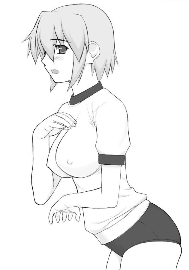 1girlassbreastscovered erect nipplesfemale focusgreyscalegym uniformlarge breastsmonochromeshort hairsimple backgroundsolowhite background