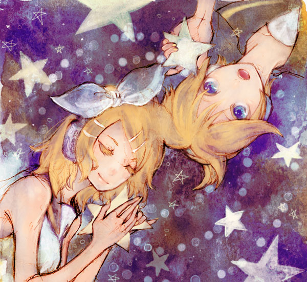 1boy1girlblonde hairblue eyesbrother and sisterclosed eyeshair ornamenthair ribbonhairclipheadphoneslyingopen mouthribbonshort hairsiblingstwins