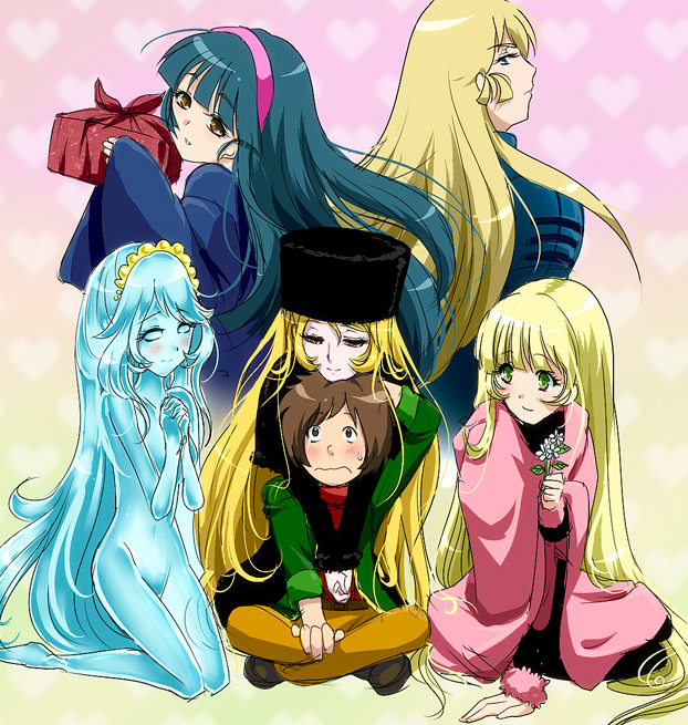 1boy5girlsalienblonde hairblue hairblushbrown eyesbrown haircrystalflowerfur hatgreen eyeshair spread outhairbandhathuglong hairlooking backmaid headdressmultiple girlsnudeown hands claspedown hands togethersmilevery long hair