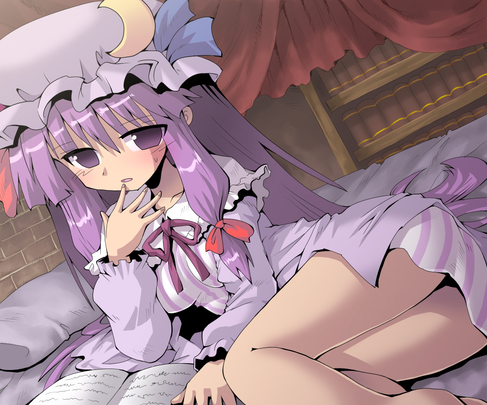 1girlassbedblushbookbookshelfbreastsbrick wallcollarboneearsfemale focushair ribbonhand to own mouthhatindoorslegslooking at viewerlyingmoon (ornament)open bookopen mouthpillowpurple eyespurple hairribbonsidelockssmall breastssolothighs