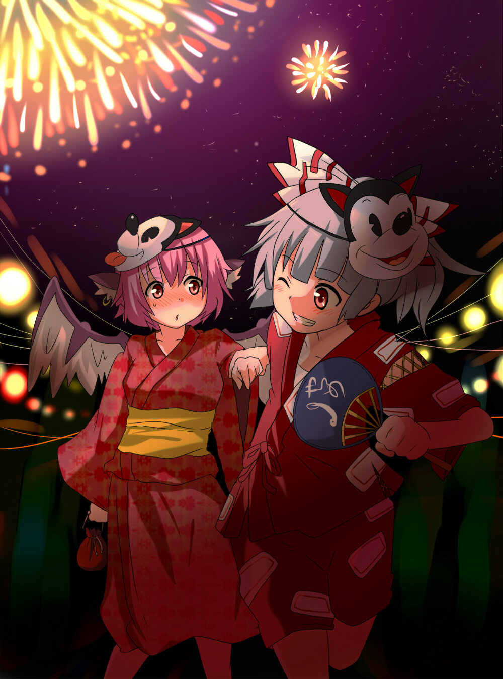 2girlsadapted costumeaerial fireworksalternate hairstyleanimal earsblushbowearringsfemale focusfireworksgrinhair bowhand fanholdingholding another's wristholding fanjapanese clothesjewelryjinbei (clothes)kimonomaskmultiple girlsnightobione eye closedoutdoorspaper fanpink hairpullingred eyessashshort hairsingle earringsmileuchiwawingswinkyukata