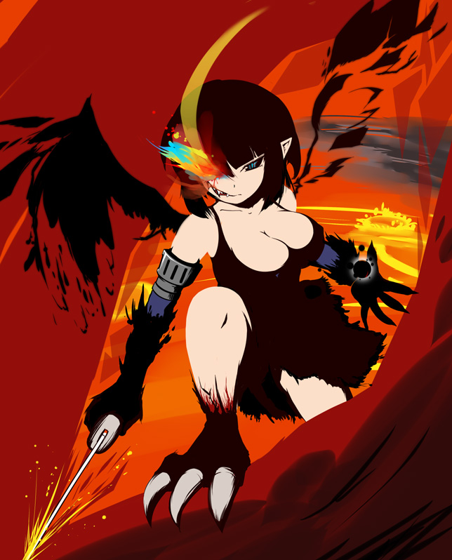 1girlbreastscleavagefangsfemale focusglowingglowing eyeglowing eyeslarge breastssoloswordweaponwings