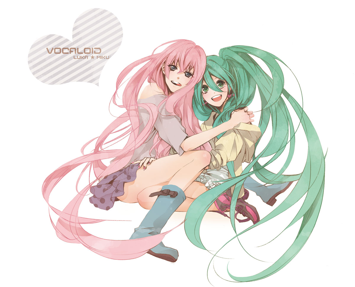 2girlsblue eyescasualfashiongreen eyesgreen hairhuglegslong hairmultiple girlspink hairsmilevery long hair
