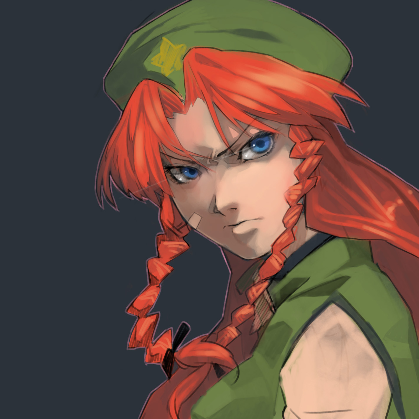 1girlblue eyesbraidbreastsfemale focushatlong hairred hairserioussimple backgroundsolotwin braidsupper body