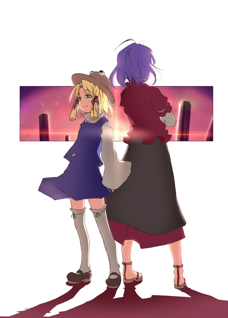 2girlsback-to-backblonde hairfemale focusgreen eyeshair ribbonhatlong sleevesmultiple girlspurple hairribbonsandalsshort hairsunsetthighhighs